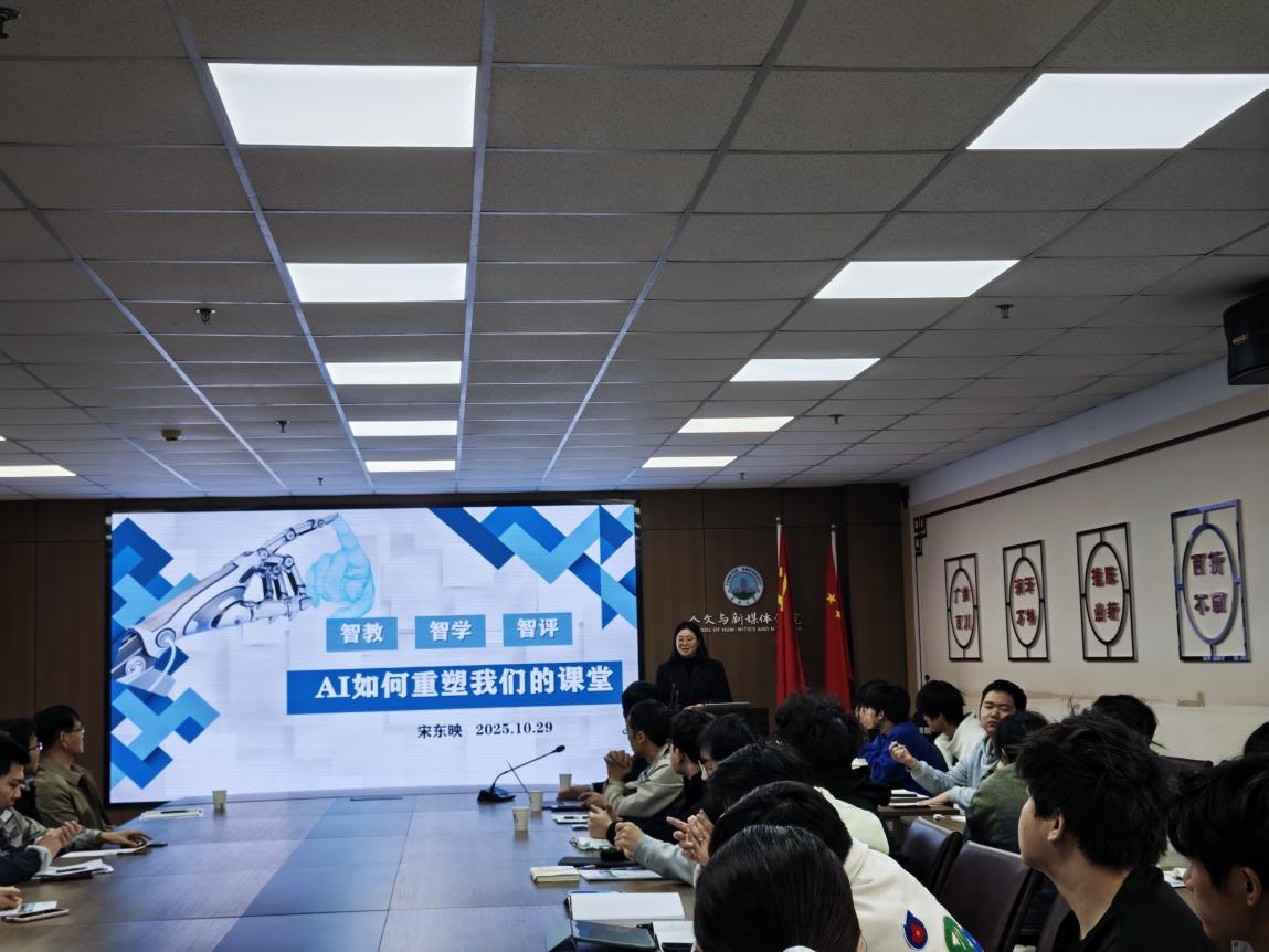 (通讯员苏明月)10月29日上午9点,一场题为《智教·智学·智评:AI如何重塑我们的课堂?》的专题讲座在文科楼705会议室举行。本次活动是人文学院历史学专业《教育见习I》实践课程的重要组成部分,旨在帮助师范生了解前沿教育技术,特邀江陵中学宋东映老师主讲。人文学院副院长柯艺、历史系李义芳、卢川、陈力、赵标等老师,与历史系2023级全体师范生一同参加。