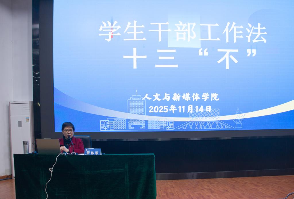 本次讲座特邀人文与新媒体学院副研究员雷体翠老师担任主讲。雷老师围绕学生干部的角色定位与核心能力,结合39个典型案例,以《学生干部工作法十三“不”》为题,从“服务优先,不计较得失”“管理自己,不随波逐流”等展开讲解,内容翔实,贴近实际。