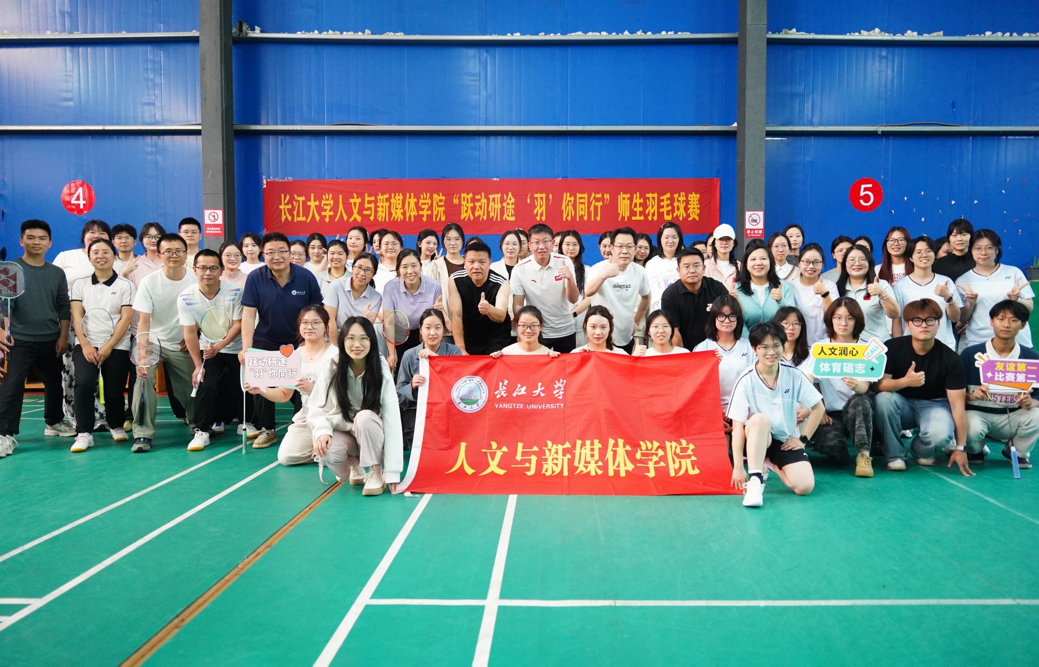 (通讯员 明艳芳)春和景明,活力飞扬。为进一步增进师生间的交流互动,丰富研究生课余生活,营造团结奋进、健康向上的学院氛围,4月23日下午,人文与新媒体学院“跃动研途‘羽’你同行”研究生师生羽毛球赛在新风羽毛球馆顺利举行,学院80余名师生踊跃参赛。