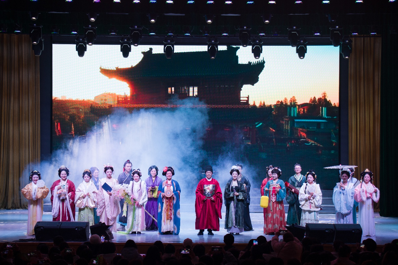 节目环节精彩纷呈,从优雅曼妙的古典舞姿到激情四射的现代舞步,从余音绕梁的歌曲演唱到寓教于乐的主题剧场。尤其是学院教师情景朗诵与汉服走秀,不仅展现华夏衣冠之美,更以沉浸式课堂的形式,完成了一场跨越千年的文化对话,凸显学院“师韵如兰、风雅相传”的育人氛围。